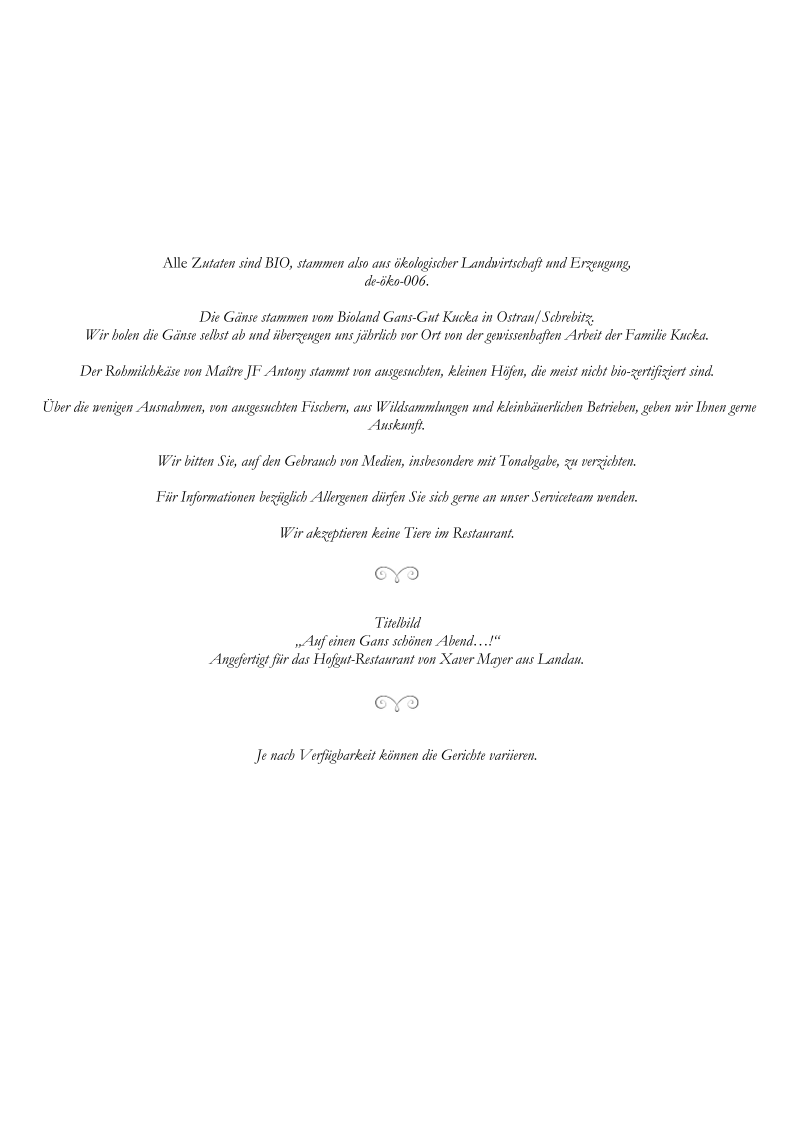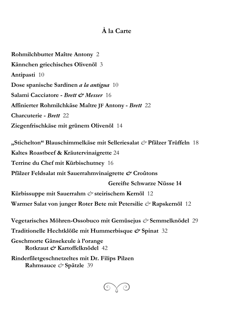 The menu at Hofgut Ruppertsberg offers a delightful blend of traditional and contemporary dishes, focusing on high-quality ingredients and regional specialties. The Rohmilchbutter Maître Antony and Kännchen griechisches Olivenöl serve as a simple yet elegant start to the meal, setting the tone for the experience. For those seeking a taste of the Mediterranean, the AntipastiDose with spanische Sardinen a la antigua and Salami Cacciatore is an excellent choice, offering rich, flavorful bites that awaken the palate. A standout is the Traditionellen Gänseessen, featuring a hearty serving of Bio-Gänsebraten, showcasing the restaurant's commitment to organic and locally sourced meats. The menu reflects a focus on quality, authenticity, and regional flavors, offering a memorable dining experience in a rustic, welcoming atmosphere.